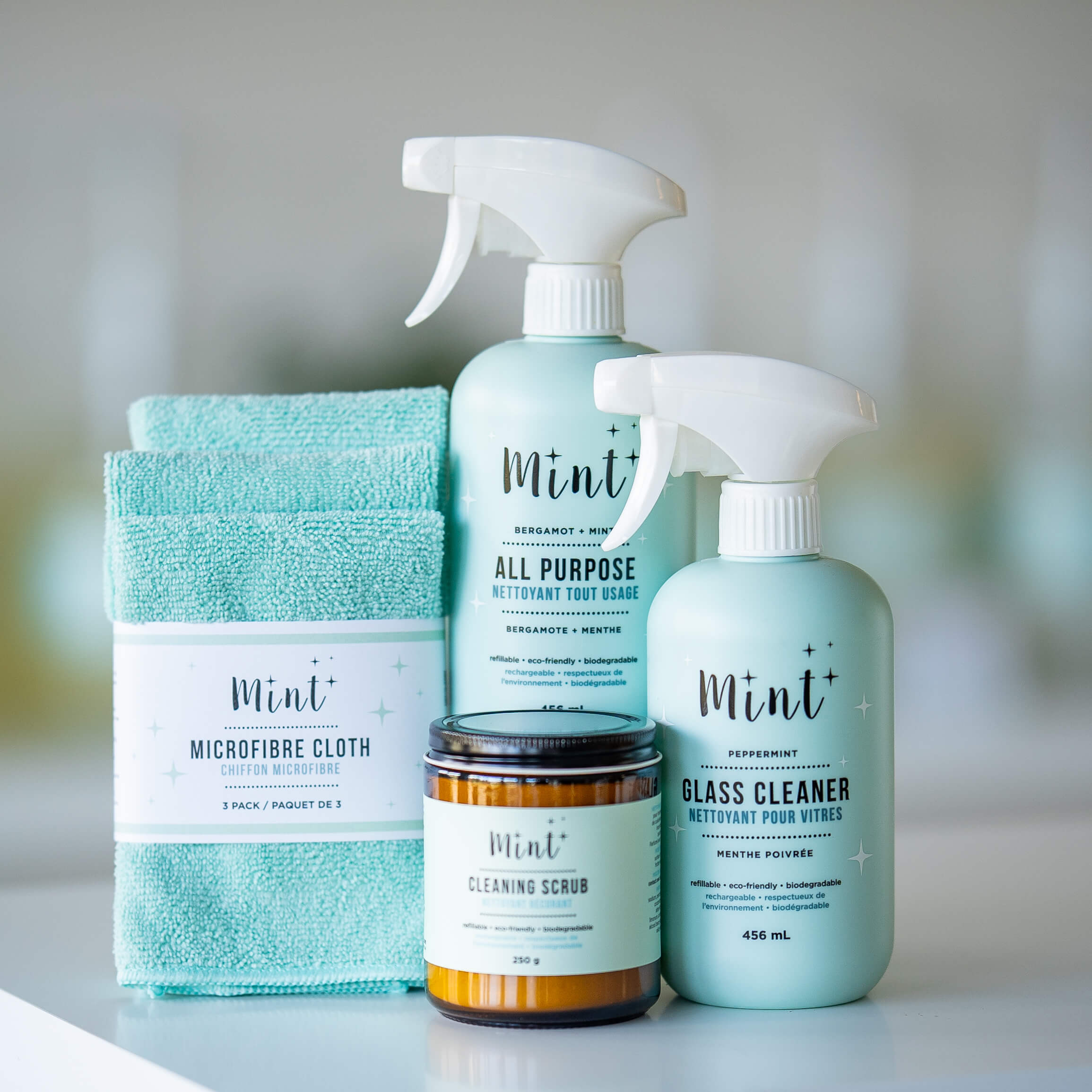 The Essential Home Care Bundle by Mint Cleaning Products, featuring all-purpose cleaner, glass cleaner, cleaning scrub, and a set of microfiber cloths, displayed on a clean surface.